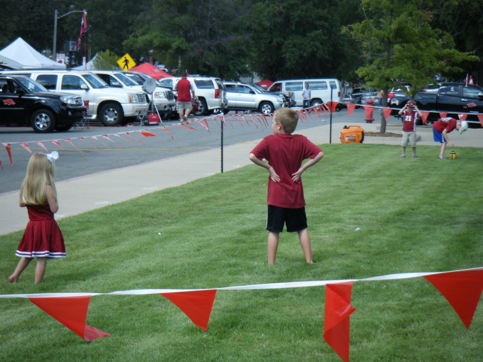 We went around to the different booths sampling the entries (both professional and amateur), let the kids run around on the field and play in some bouncy houses, and then settled in to watch the painful first half of the game. We also witnessed the cheese dip eating contest at halftime. It was both impressive and disgusting (but mostly disgusting) to watch people try to consume 5 lbs. of cheese dip in 5 minutes!